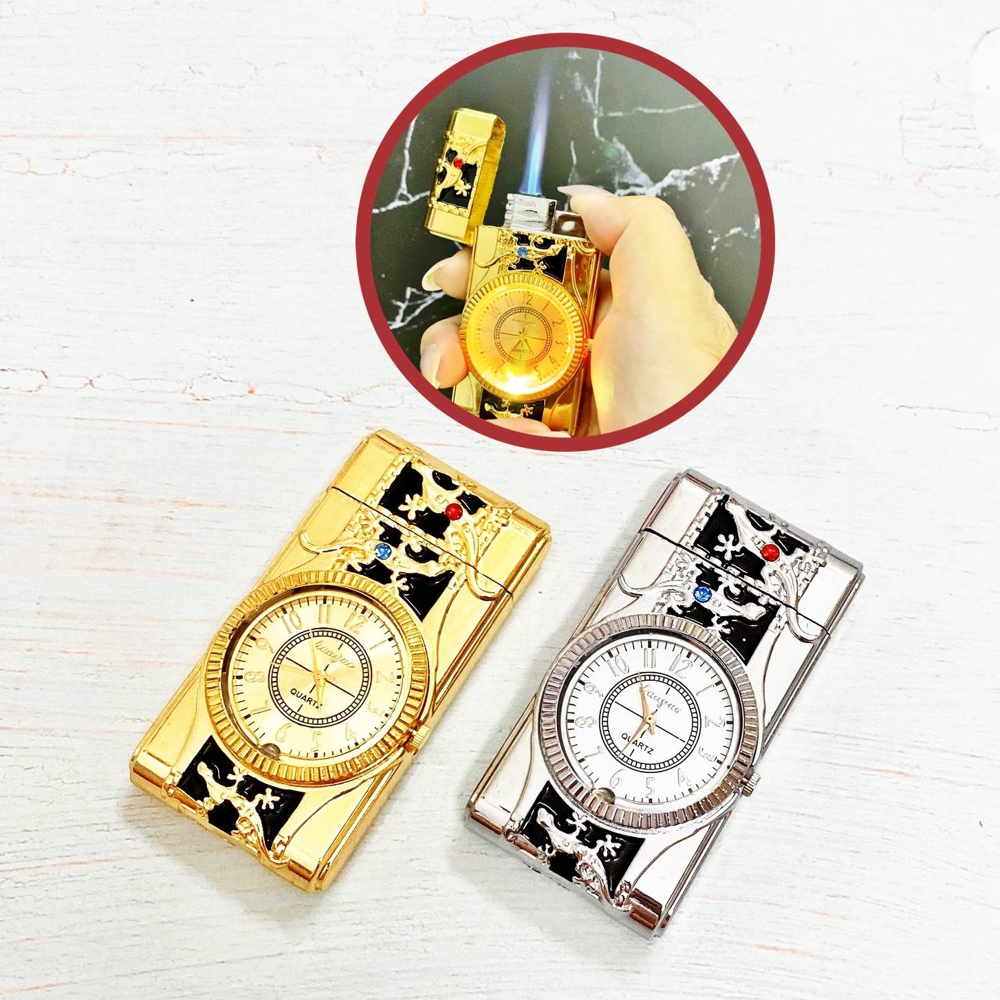 Bật lửa kiêm đồng hồ để bàn hình tắc kè xài gas nạp lại được khi dùng hết. Bật lửa có đèn LED.