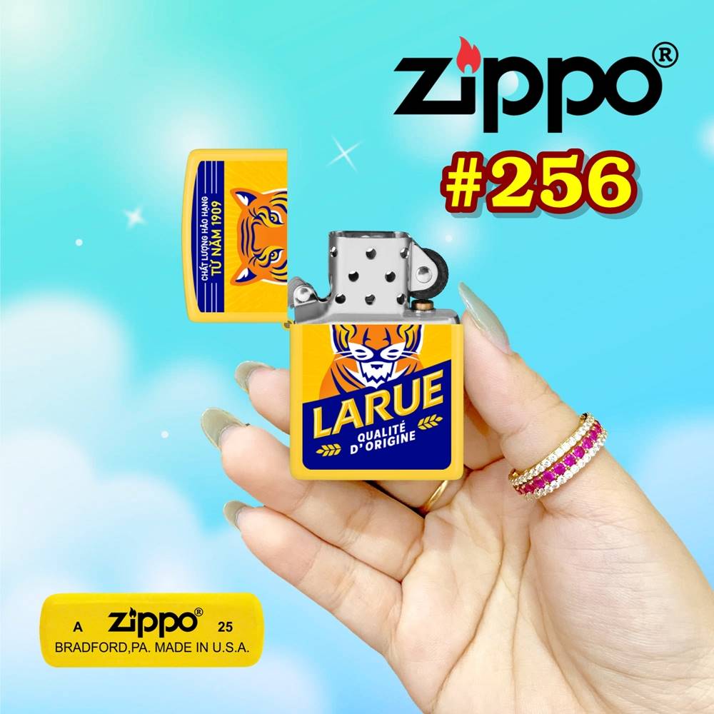Sản phẩm nổi bật với lớp sơn tĩnh điện cao cấp, mang lại bề mặt mịn màng, sang trọng và đặc biệt là khả năng chống trầy xước, phai màu vượt trội. Hai mặt bật lửa được trang trí tinh xảo với hình ảnh logo bia Larue, một biểu tượng quen thuộc và đầy sức hút, tạo nên điểm nhấn ấn tượng ngay từ cái nhìn đầu tiên. Thiết kế 2 mặt độc đáo không chỉ tăng thêm tính thẩm mỹ mà còn thể hiện sự tỉ mỉ, chau chuốt của thương hiệu Zippo.