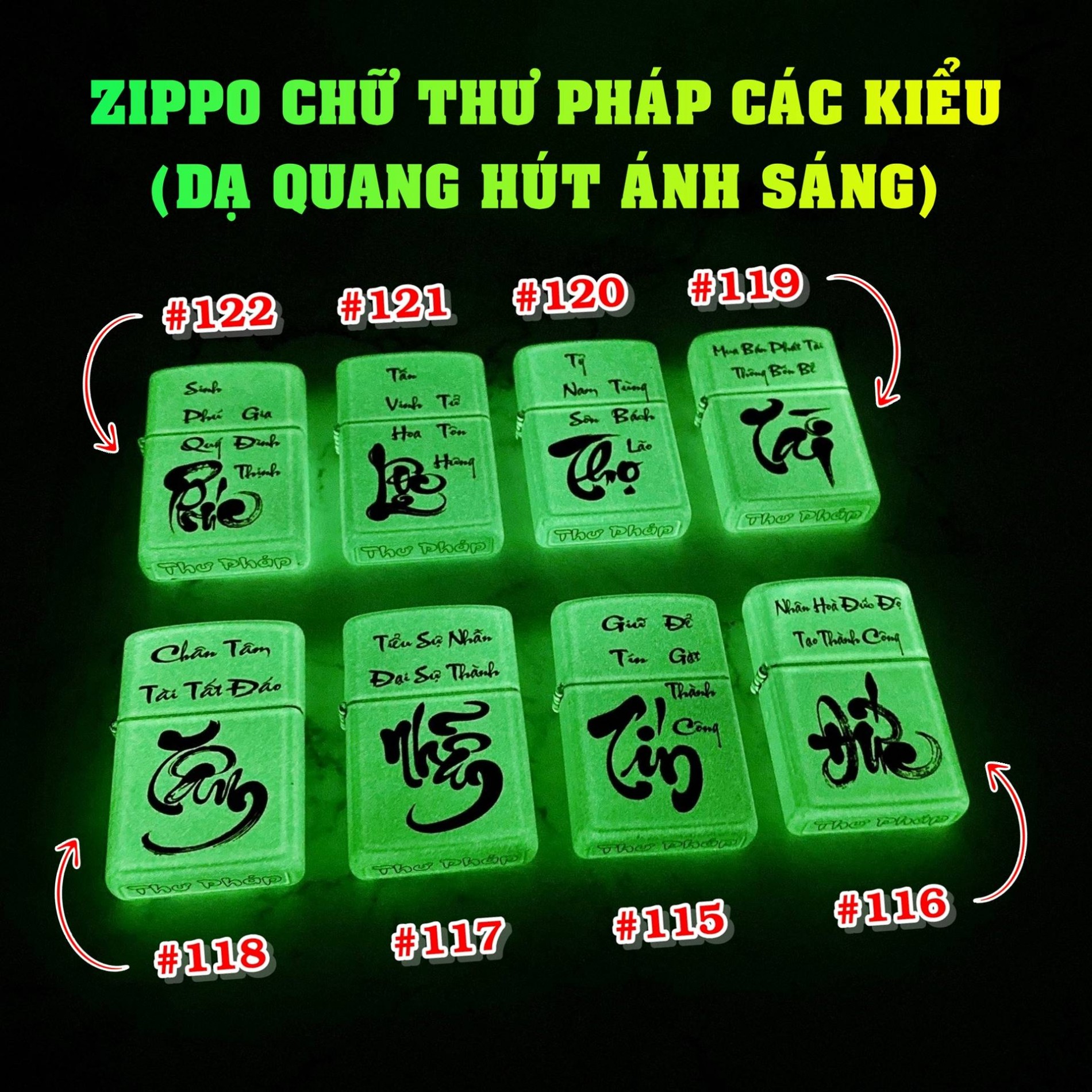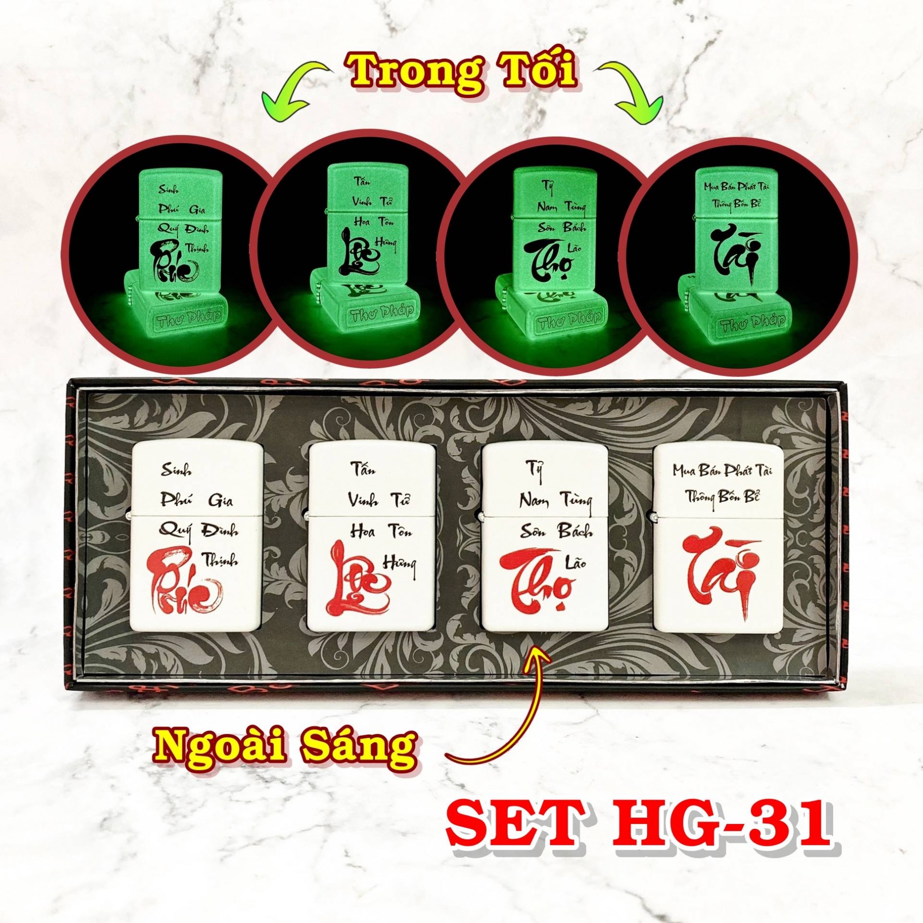 Với thiết kế tinh xảo, bộ bật lửa Zippo này mang trên mình những nét chữ thư pháp uyển chuyển, tượng trưng cho bốn chữ vàng: Phúc (hạnh phúc), Lộc (tài lộc), Thọ (sức khỏe, trường thọ) và Tài (thịnh vượng). Mỗi chữ được khắc họa tỉ mỉ, mang đến một vẻ đẹp cổ điển nhưng không kém phần sang trọng. Đặc biệt, lớp dạ quang độc đáo giúp các họa tiết này phát sáng trong bóng tối, tạo nên hiệu ứng thị giác ấn tượng và bí ẩn, thu hút mọi ánh nhìn.