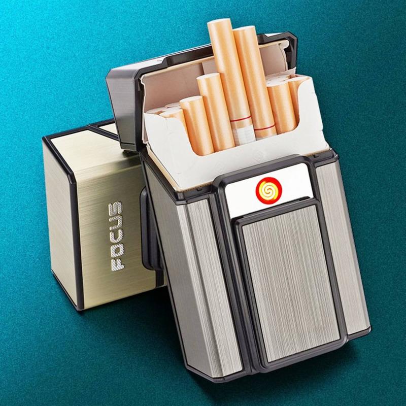 Hộp đựng thuốc lá 20 điếu kiêm mồi lửa điện hồng ngoại 2 trong 1. Thiết bị được đính kèm theo dây sạc USB tiện lợi không ngại mưa gió ngoài trời.